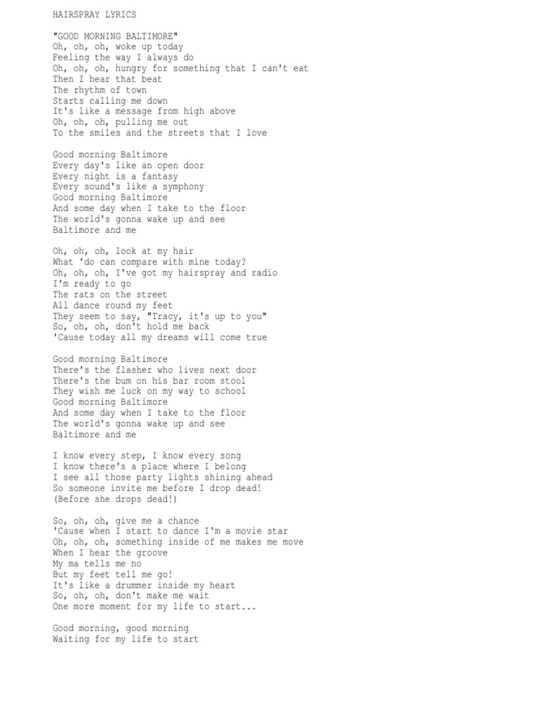 It takes two (the legend of) miss baltimore crabs. Oh, oh, oh, i've got my hairspray and radio i'm ready to go the rats on the street all dance round my feet they seem to say tracy, it's up to you so, oh, oh don't hold me back 'cause today all my dreams will come true good morning baltimore there's the flasher who lives next door there's the bum on his bar room stool they wish me luck on my. Checkin' shit but chips, all these hoes fair game when i slide glocks out, bounce out, bare face bitches get it too, get on they wig like some hair spray. Mama, i'm a big girl now. As it races down the hill. (musicals aren't all super cheesy) racism in hairspray lyrics they can try to stop the paradise we're dreamin of but you cannot stop the rhythm of two hearts in love. Original lyrics of (it's) hairspray song by hairspray. 'cause when he nudged me. The nicest kids in town lyrics. Music she wants to become a dancer on a local daytime t.v. Comment and share your favourite lyrics. I do not own this songlyrics to hairspray i can hear the bellssorry for the photo, this was the best quality i could find and it was covered in purple (hen. * willy nilly willy nilly / willy nilly willy nilly / willy nilly willy nilly, yeah / willy nilly willy nilly / willy nilly willy nilly / willy.